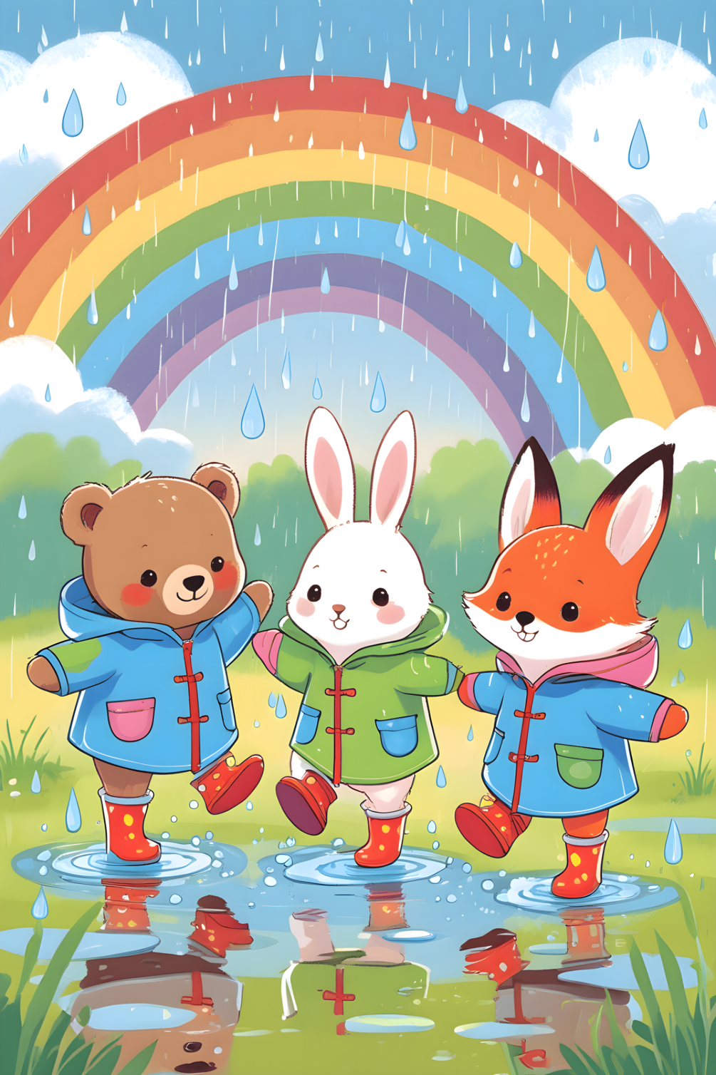 # Cheerful animals in raincoats jumping puddles